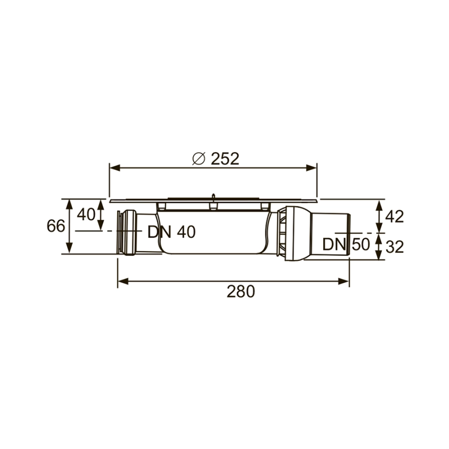 - Сифон пластиковый (PP) низкий c горизонтальным поворотным отводом DN 50 и горизонтальным прямым входом DN 40 с заглушкой;