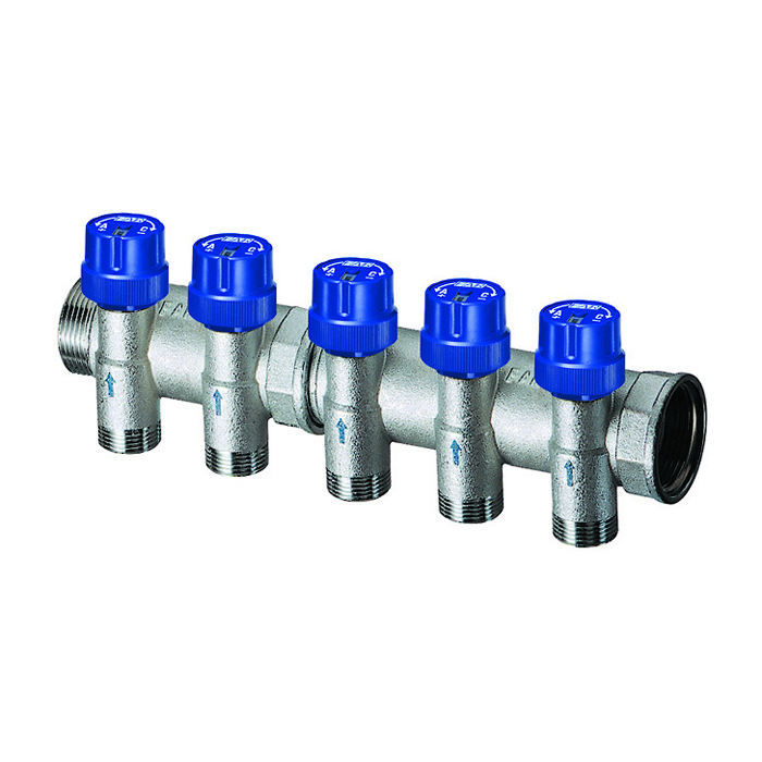 FAR MultiFAR Терморегулирующий проходной коллектор под установку электротермическую головку M30x1,5 с 2 отводами 1"-3/4",евроконус FK 3911 13402