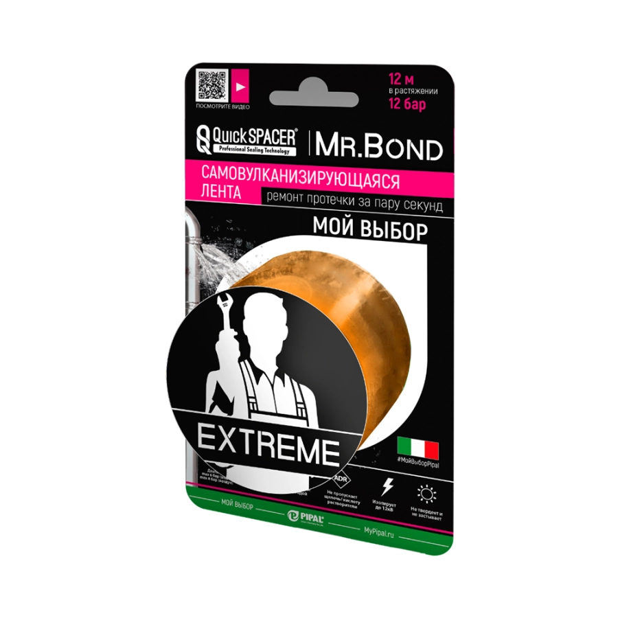 Самозаклеивающаяся силиконовая лента QS Mr.Bond® EXTREME, является профессиональным средством для оперативного ремонта в экстренных ситуациях. Эластичные свойства силиконовой ленты позволяют устранять технически сложные повреждения, благодаря повышенной прочности на разрыв.