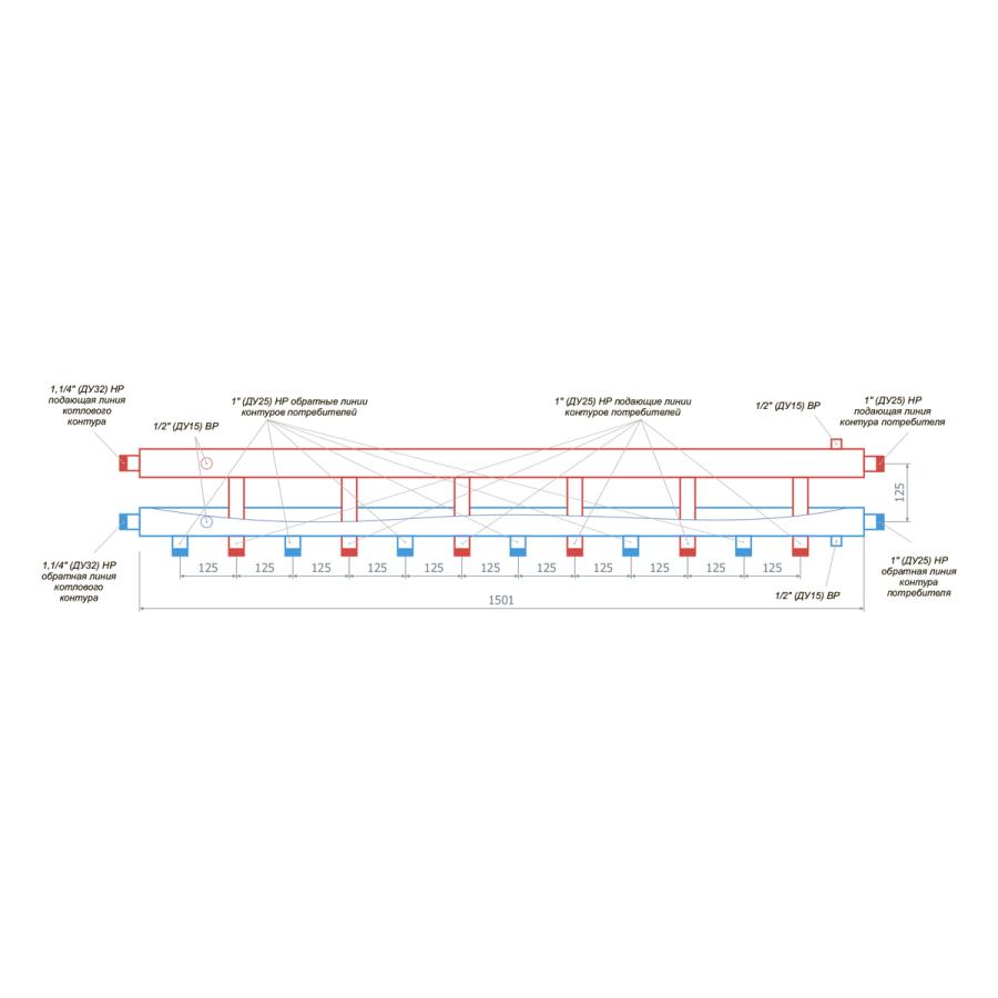 Модульный коллектор отопления на 7 контуров горизонтальный RISPA КМГ60-7ВН — применяется в котельных автономных систем отопления с целью равномерного распределения теплоносителя по семи контурам. Этот коллектор/гребенка рассчитан на использование с котлом мощностью до 60 кВт. Может работать в паре с гидрострелкой ГРУ 60-1В с расширенными патрубками.