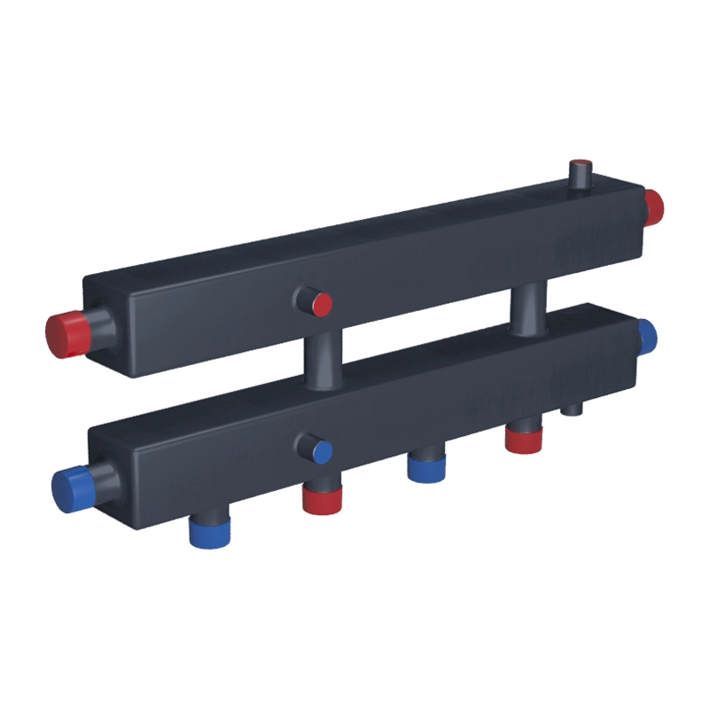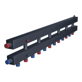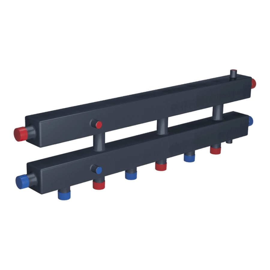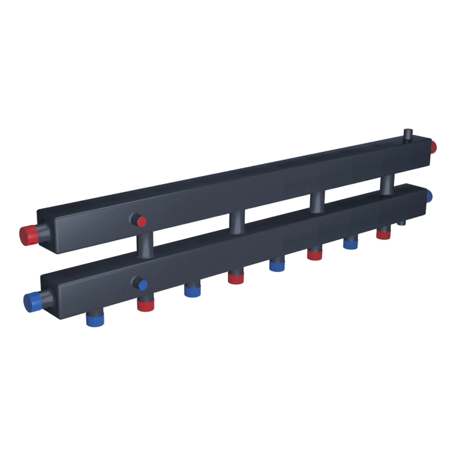 Модульный коллектор отопления на 7 контуров горизонтальный RISPA КМГ60-7ВН — применяется в котельных автономных систем отопления с целью равномерного распределения теплоносителя по семи контурам. Этот коллектор/гребенка рассчитан на использование с котлом мощностью до 60 кВт. Может работать в паре с гидрострелкой ГРУ 60-1В с расширенными патрубками.