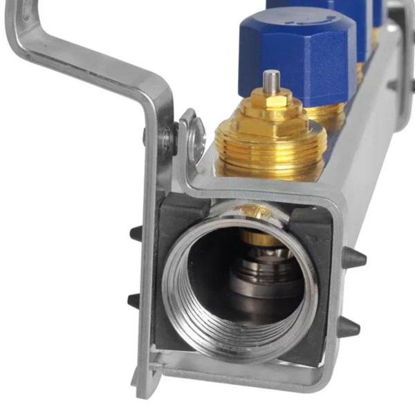 Коллекторная группа объединяет в себе подающий и обратный коллекторные блоки из нержавеющей стали марки AISI304 сечением 39х41 мм с диаметром подключения G1”, расходомеры (ротаметры), запорно-балансировочные клапаны, термостатические клапаны (с возможностью установки электротермического сервопривода под резьбу М30х1,5), воздухоотводчики, дренажные клапаны и крепежные кронштейны.