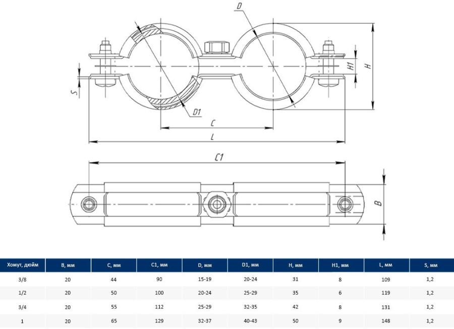 Taners Хомут двойной М8 1/2" (20-24мм) TN.0320.000.005.0012.S