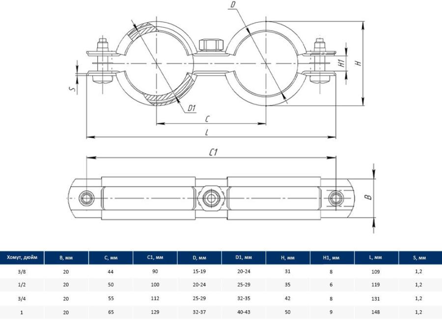 Taners Хомут двойной М8 1" (32-37мм) TN.0320.000.007.0100.S