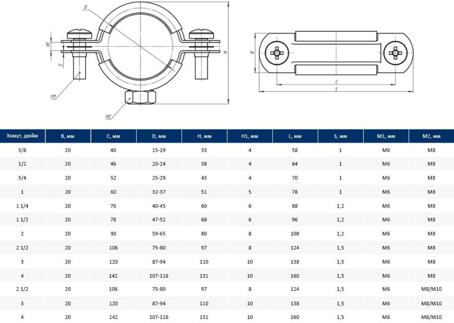 Taners Хомут трубный двухвинтовой М8 1 1/2" (47-52мм) TN.0310.000.009.0112.S
