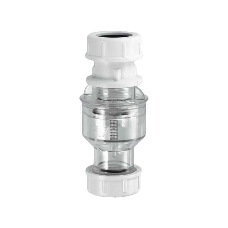 Изделие оснащено функцией сухого гидрозатвора. Благодаря этому клапан с подпружиненной мембраной надежно защищает приборы от обратного потока канализационных вод. Кроме того, гидрозатвор с обратным клапаном предотвращает проникновение неприятных запахов в помещение. Отсутствие так называемого «мокрого» гидрозатвора обуславливает стойкость клапана к гниению. Для визуального контроля за функционированием обратного клапана разработчики компании предусмотрели прозрачную колбу в конструкции. Компрессионное соединение гарантирует прочное подключение клапана обратного с функцией сухого гидрозатвора mcalpine к системе.
