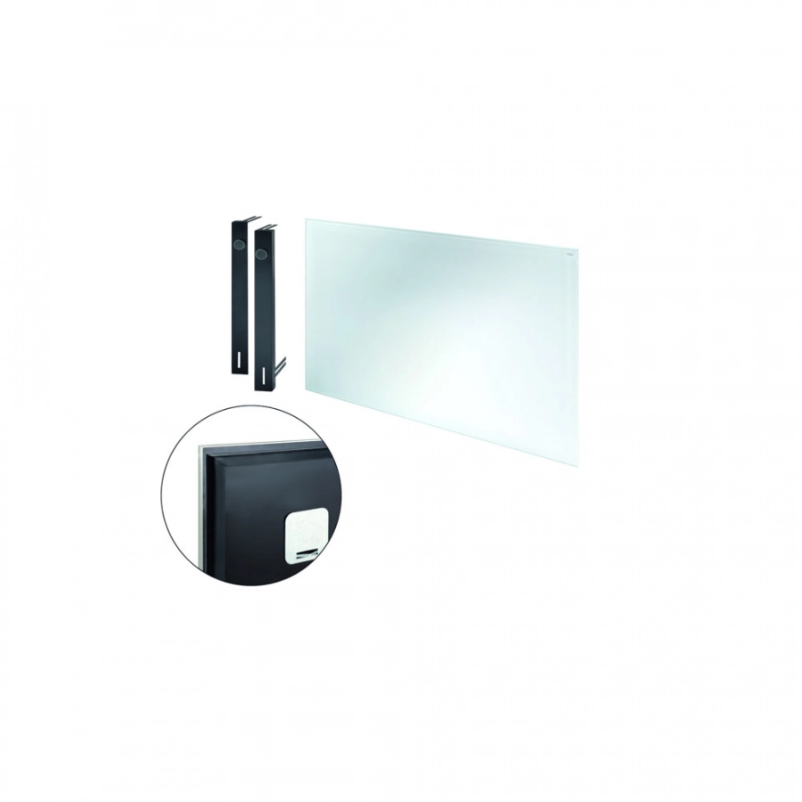 По высоте и ширине панель перекрывает размеры металлической рамки примерно на 15 мм, закрывая края обоев или крашенные кромки стен. Комплект состоит из стеклянной панели и регулируемых по глубине держателей с магнитами.