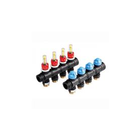 Модульно расширяемый, отводы отопительных контуров 3/4", Евроконус. Подающая линия с предустановленными расходомерами на 3,5 л/мин, обратная линия со встроенными клапанами М30 × 1,5 мм.